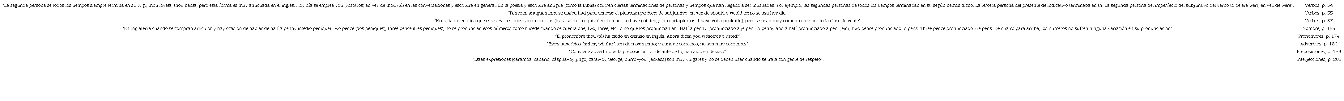 La sintaxis también ocupa algunas páginas en la Novísima gramática (1,9 %) y en el Compendio (0,4 %), páginas en las que se aborda, utilizando la terminología académica, solo la sintaxis regular (no la figurada)33 y solo cuestiones relativas al régimen y a la construcción (no a la concordancia). Así, Vall se detiene en la colocación de adjetivos, sustantivos, preposiciones y adverbios en diferentes construcciones sintácticas (“el nominativo va después de los verbos to be, can y have, cuando están en pretérito, o empiezan ciertas oraciones que tienen que traducirse con la conjugación si, seguida del nombre”, 1886, p. 212) y advierte sobre los diferentes equivalentes entre las dos lenguas de determinadas oraciones (“cuando las oraciones de relativo van regidas de otros verbos que están en el presente, o imperfecto de indicativo, a menudo se resuelven por el gerundio”, p. 214).