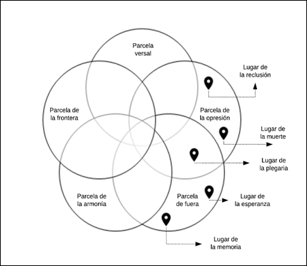 Partiendo de los dos conceptos anteriores, se puede afirmar que el espacialismo del desarraigo en Poemas construye un sistema de cinco parcelas imaginarias y semánticas, las cuales materializan las relaciones de poder y presiones sociales ejercidas sobre el presidio de San Lucas y, por tanto, sobre la subjetivación lírica. A continuación, se visualiza dicho sistema en el siguiente diagrama (Figura 1) y, luego, se procede con su descripción.