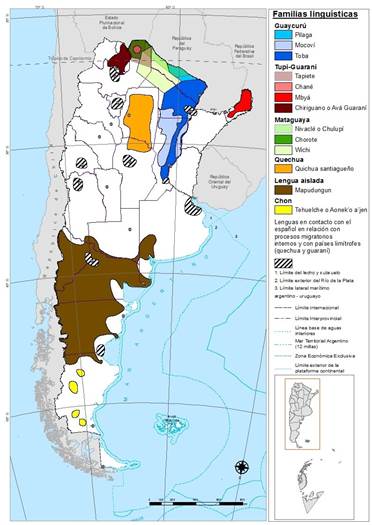 Las lenguas oriundas del territorio argentino son las siguientes: toba, pilagá, mocoví (familia guaycurú), wichí, nivaclé, chorote (familia mataguaya), tapiete, ava-guaraní, mbya, guaraní correntino (familia tupi-guaraní), quichua santiagueño (familia quechua), tehuelche (familia chon) y mapudungun1 (aislada). Algunas de estas, como el quichua en la provincia de Santiago del Estero2 y el guaraní en Corrientes3, son lenguas indígenas habladas por una cantidad importante de población criolla no indígena (Censabella, 1999, p. 40). Gracias a investigaciones recientes, se pueden agregar a la lista las lenguas vilela (familia lule-vilela), considerada extinta desde la década de 1960 (Golluscio, 2008), y chaná (familia charrúa), oculta durante casi doscientos años (Viegas Barros, 2009).