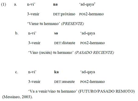 Tal es el caso de las lenguas guaycurúes y mataguayas, en las que el tiempo no es una categoría gramaticalizada en el verbo, sino que se construye discursivamente mediante distintos elementos que permiten la ubicación deíctica del evento en relación con el momento de habla. El toba, por ejemplo, posee un sistema de determinantes con una amplia funcionalidad, que contribuye al señalamiento del tiempo, la modalidad y la evidencialidad (Klein y Messineo, 2003; Messineo, 2003; Messineo, Carol y Klein 2016). Así, el determinante demostrativo na -que indica que la referencia del nombre al que acompaña está “acercándose a la vista”- favorece una interpretación de tiempo presente; el deíctico so -que señala que algo/alguien está “alejándose de la vista”- favorece una interpretación de pasado reciente, mientras que la forma ca -que señala personas u objetos “fuera de la vista”- favorece una lectura de pasado (o de futuro) remoto (Klein y Messineo, 2003, p. 4). Como se observa en la glosa de los siguientes ejemplos, las oraciones expresan presente, pasado o futuro (‘viene’/ ‘vino’ / ‘va a venir’) pero el verbo (nvi’) permanece invariable7: