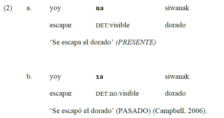 En las lenguas guaycurúes y mataguayas, por su parte, también se expresa la noción de evidencialidad. En toba y nivaclé, por ejemplo, el sistema de determinantes que se ha ejemplificado en (1-2) juega también un rol en el señalamiento de la evidencialidad. Allí, los determinantes que expresan que el referente está ‘a la vista’ funcionan como evidenciales constatativos, frente a aquellos que señalan que los sucesos a los que el hablante se refiere en su enunciado no han sido constatados o verificados por él mismo, ya que están fuera de su campo visual. En estos últimos surgen una lectura evidencial reportativa o no experiencial. En chorote, por su parte, existe un morfema que indica que el participante sabe de oídas lo que afirma (en (11) -jom):
