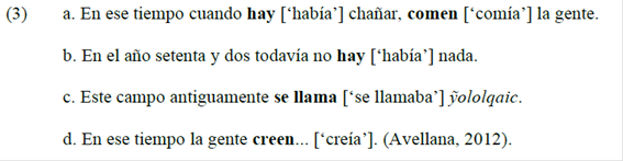 Estas mismas características aparecen con claridad también en el español de estos hablantes. Así, en los bilingües español-toba se observa cómo el español -una lengua orientada a la gramática en cuanto al señalamiento temporal- se reorienta hacia el discurso. En (3) estos hablantes utilizan formas verbales de presente con valor semántico de pasado: