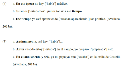 La información que vincula las situaciones con el momento de habla en (3) se establece mediante distintos elementos, fundamentalmente no verbales. Así, el tiempo puede ser introducido a través de un sintagma con valor temporal, que contiene con frecuencia el demostrativo ese/esa (4), o bien mediante adverbios u otras construcciones temporales (5), tal como sucede en toba (Klein y Messineo, 2003; Avellana, 2013a):