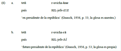 Los morfemas kue y rã introducen un valor aspectual sobre la propiedad o relación denotada por el nombre y permiten designar ‘algo que ya no es’ (6a) o ‘algo que será’ (6b).