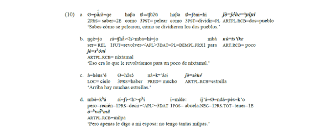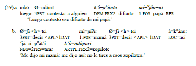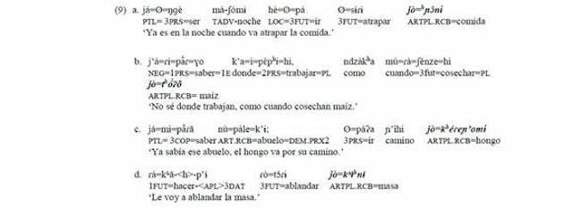 Los alomorfos jo y o codifican número plural; estos morfemas, en el ámbito gramatical, exhiben el sentido de un artículo reconocible y de uno definido. En (9), estos proclíticos aparecen con entidades que en la lengua se denominan de manera plural, como hɲɔ̂nɨ ‘comida’, thõ̀ʔõ ‘maíz’, khéɾeɲ’omɨ ‘hongo’ y kʰɨ̀hnɨ́ ‘masa’. Estos sustantivos aparecen de manera sistemática con esta marca; estos proclíticos en este ámbito codifican referencia reconocible, están bajo tratamiento en un evento comunicativo.