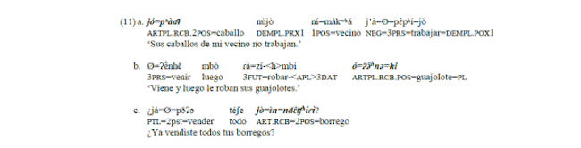 El artículo reconocible plural, igualmente, es el morfema que le sirve de huésped a un tono alto que codifica posesión, como en (11). En las FNs de (11a), jó pʰàɗɨ́ y (11b) ó ʔə̂hnəhi, la entidad poseedora, tercera persona plural, está codificada en el tono que a su vez se configura en las formas jo o o. No se pierda de vista que esto ocurre con la tercera persona, al tratar de otra persona, como en (11c), jo ìn ndɛ̂ʧhɨɾɨ, se codificada la marca de posesión en un morfema independiente.
