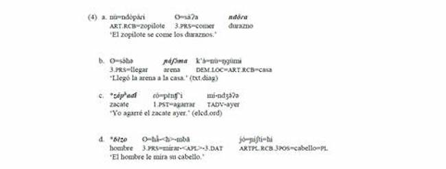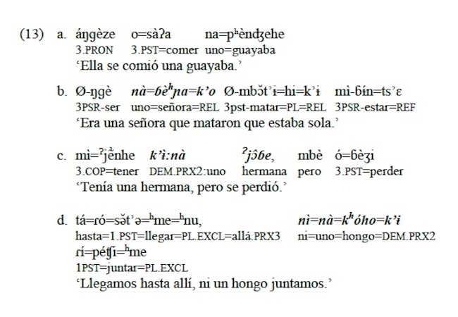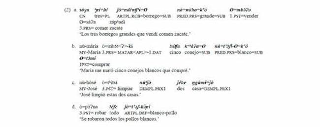 En (2a) se ejemplifica una frase nominal compleja sàɣa ʰɲíhi jò ndɛ̂nʧʰɨ nà nòho k’ó mbɔ̌Ɂɔ ‘los tres borregos grandes que vendí’; el nominal nuclear ndɛ̂nʧʰɨ está modificado por un artículo, un numeral, el predicado que expresa el concepto de propiedad y una cláusula relativa. Por su parte, en la FN de (2b), tsíʧa kʷʰáɁa nà t’ɔ̌ʃɨ k’ó tɔ́mɨ ‘cinco conejos blancos que compré’, el núcleo nominal kʷʰáɁa está cuantificado por un numeral y modificado por un predicado que expresa un concepto de propiedad y una cláusula relativa; en este contexto no aparece ninguna clase de artículo. En (2c), el núcleo ŋgùmɨ en nùʰjò jéhe ŋgùmɨjò ‘estas dos casas’ aparece modificado por un numeral, un demostrativo expresado en un morfema libre y a la vez de un demostrativo en forma de morfema ligado. En la FN de (2d), téʃe jò t’ɔʃkɔ̂ɲi ‘todos los pollos blancos’, el núcleo ŋɡɔɲi aparece cuantificado y modificado por un artículo identificable y un adjetivo.