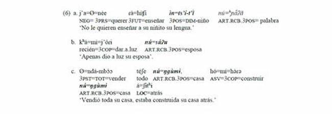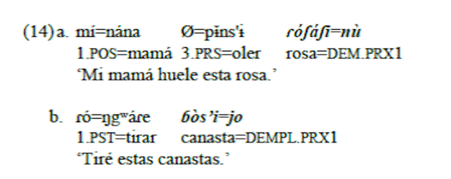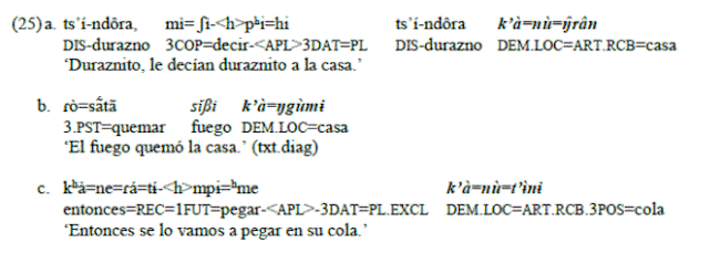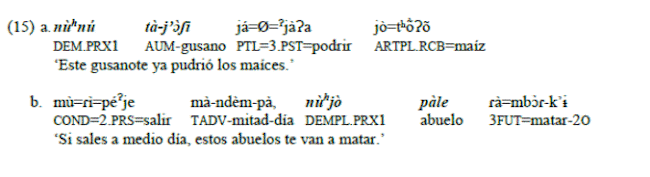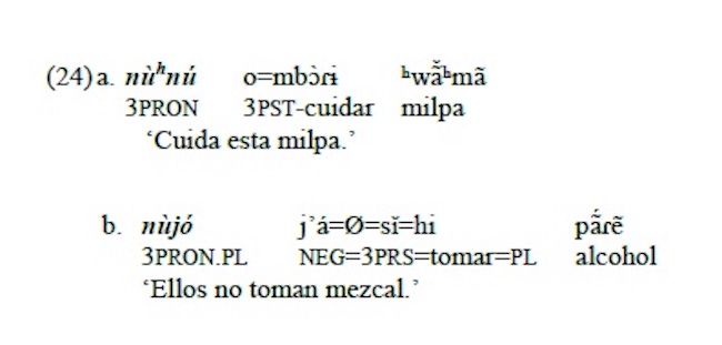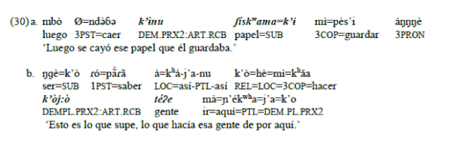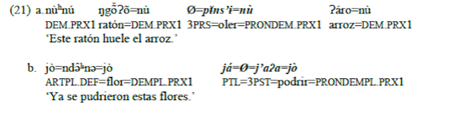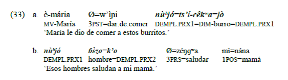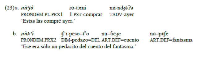 Los demostrativos expresados en morfemas libres, nùʰjó y nùk’ɨ̀, como en (23), también expresan relaciones gramaticales. Como ya se dijo, estos se ubican en posición preverbal, posición que ocupan los pronombres personales, como en (24).