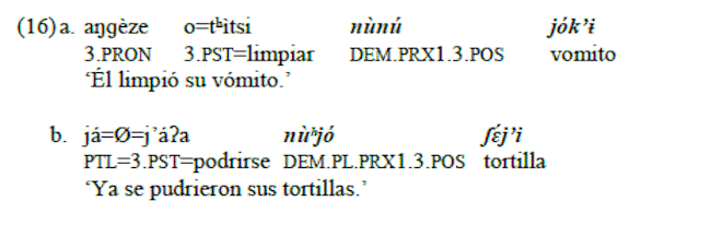 En este juego de demostrativos se configura un tono alto para dar cuenta de la posesión. En (16) las FNs nùnú jók’ɨ y nùʰjó ʃɛ́ʔji el tono alto que se configura sobre nú y ʰjó codifica a la la entidad poseedora.
