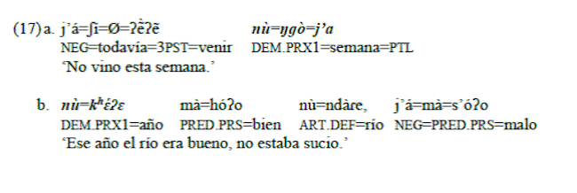 Finalmente, el proclítico nu, como en (17), codifica proximidad 1; esta forma tiene un uso muy exclusivo, ya que sólo da cuenta de nominales que denotan lapsos de tiempo como nù ŋɡò o nù khɛ́ʔɛ. La ubicación o locación del referente debe estar bajo el dominio de los interlocutores del acto de habla.