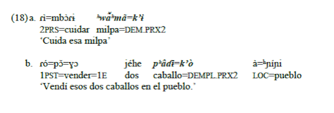 El segundo juego de demostrativos exhibe el grado de proximidad 2, como en (18). Los núcleos nominales de las FNs en donde aparecen estos enclíticos, k’ɨ y k’ò, pueden o no coaparecer con algún otro modificador gramatical propio de la estructura de la FN como el numeral jéhe ‘dos’ de (18b). El referente denotado por el nominal puede o no estar bajo el dominio espectral de los interlocutores del acto de habla.
