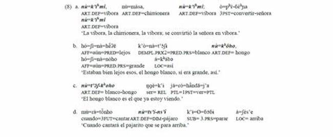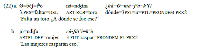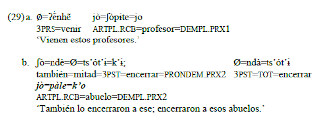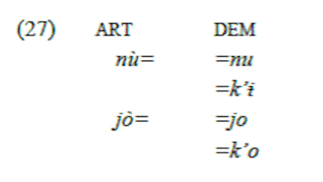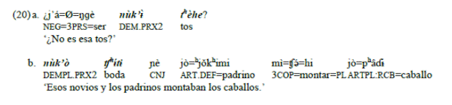 Los morfemas k’ɨ y k’ò, como en (19), se realizan también como proclíticos. Si bien se ha mostrado que los artículos se originan de demostrativos (Lyons, 1999; Diessel, 1999;), en el caso específico del mazahua no se dispone de suficiente evidencia para asegurar que este sea uno de estos casos, ya que estos proclíticos expresan, con respecto al referente en cuestión, un grado de proximidad de medianía y distancia lejana.