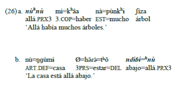 Dentro del paradigma de adverbios que codifican grados de locación, las proformas nùhnù y hnù, presentes en (26), codifican el grado máximo de distancia con respecto al punto de referencia. Este se encuentra muy distante o fuera del espectro de visibilidad de los interlocutores del acto de habla.