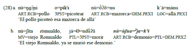 En las FNs de (28a) nù ʧõɁõ nù y (28b) nù ùʃuaɁja k’ɨ, coocurren artículos y demostrativos. Dado que el artículo reconocible, en estos contextos, sólo tiende a fungir como una marca del nominal, aparece con un demostrativo que expresa proximidad 1 o proximidad 2.
