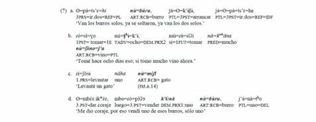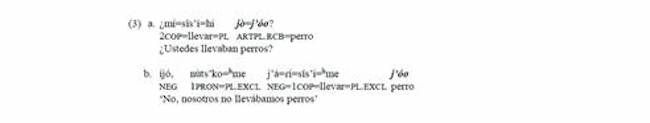 A través de estos ejemplos se puede vislumbrar, como lo menciona Becker (2018), que los artículos no solamente están influenciados por la referencialidad sino por otros rasgos gramaticales o por algunos factores discursivos. En la pregunta de (3a), el nominal j’oo ‘perro’ aparece con el artículo plural reconocible, este artículo no aparece en la respuesta ilustrada en (3b); esto obedece a una de las restricciones de distribución encontradas en la lengua; el artículo no aparece en contextos en los que su presencia es esperable de acuerdo con su función referencial.
