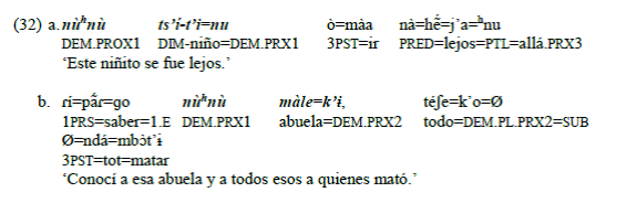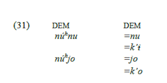 Los morfemas libres, además de codificar referencia anafórica, expresan número, como en (32b) nùhnù màlek’ɨ y (33b) nùʰjó ɓɛ̀zok’o; en el primer caso singular y en el segundo plural. Nótese que en esta clase de correlaciones no necesariamente coaparecen los demostrativos que codifican el mismo grado de proximidad. Esto se debe a que el pronombre que aparece en forma de enclítico codifica deixis; en consecuencia, es la unidad morfológica que indica la posición de una entidad con respecto a la situación discursiva y orienta la atención de los interlocutores con respecto al referente que está bajo discusión.