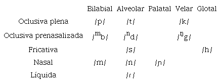 En la Tabla 1 se resume el sistema de fonemas consonánticos del mangue, según se desprende del análisis realizado a lo largo de este apartado. Como ya se ha mostrado, el inventario parece constar de tres oclusivas plenas (realizadas como sordas), tres oclusivas prenasalizadas (realizadas mayoritariamente como sonoras), tres nasales, dos fricativas y una líquida. El fonema nasal /ɲ/ se categoriza como palatal, dado que se desconoce su punto de articulación exacto. No se incluyen fonemas deslizados, ya que, como se ha señalado, ninguna información en las fuentes puede justificar el estatus fonémico de estos sonidos.