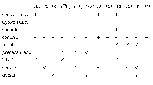 Ya que un análisis extenso de la representación fonológica de la prenasalización queda fuera del alcance de este artículo, se emplea en la Tabla 2 el rasgo ENT#091;prenasalizadoENT#093; con la misma justificación que Herbert (1986, p. 94): no representa ningún sesgo teórico y sirve para cubrir cualquier estrategia que se proponga para formalizar el fenómeno. Dicho de modo simplificado, indica que la primera parte del sonido se pronuncia con el velo del paladar descendido y la segunda parte con el velo levantado.