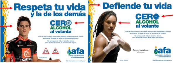 Estas personalidades nacionales transmiten un mensaje a las personas lectoras de los carteles, en cuanto a la prevención del consumo de alcohol, por medio de una demanda: respetar y defender su vida y la de los demás, incluso cuando en ambos textos no aparezcan globos de diálogo. De acuerdo con Kress y van Leeuwen (2006), esta fotografía de la demanda o demand picture se lleva a cabo por medio de la mirada directa de ambos personajes al público y es utilizada con frecuencia en publicidad. La demanda será exitosa si los participantes representados captan la atención del público meta y le hacen sentirse involucrado de tal forma que lleve a cabo cambios en su conducta. Lo anterior requiere que se establezca una conexión entre estos modelos (a quienes podemos escuchar y seguir su ejemplo) y los y las receptoras del mensaje. Conviene subrayar que la posición y tamaño de las fotografías, además del título de ambos carteles fueron los segmentos tomados en cuenta para el análisis de estos textos, en primera instancia. El siguiente segmento significativo que se tomó en cuenta fue la frase «CERO ALCOHOL al volante», en la cual, además de utilizarse letras mayúsculas para las palabras más significativas, se utilizan dos íconos como parte de la palabra cero que representan el deporte que cada una de las personalidades practica.