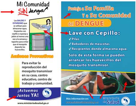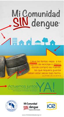 Este cartel puede interpretarse como un llamado por parte de las instituciones creadoras, el Ministerio de Salud y el ICE, pues son ellas las que están llevando a cabo el enunciado «Mi Comunidad SIN Dengue». Cada vector (triángulo azul, amarillo, verde), conecta los diferentes segmentos del mensaje y del propio cartel. Como resultado, se analizó todo el cartel en conjunto, tomando inicialmente el título por su prominencia, en particular de la palabra sin, en la cual se usa el color rojo y aparecen todas las letras en mayúscula para darle más saliencia. Luego, se prosiguió con la combinación de elementos visuales (representación de la comunidad y de posibles desechos) y de elementos verbales. Estos últimos constituyen un llamado explícito a llevar a cabo acciones por medio de imperativos («lleve», «déjelas» y «Actuemos juntos YA!»), sumados a una explicación de los pasos a seguir para que las comunidades prevengan posibles criaderos del dengue en materiales desechados al aire libre. El participante relevante en este cartel es el propio enunciado, es decir, el contenido que se le desea proyectar al público meta de la campaña.