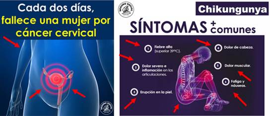 Para comprender mejor, observemos los siguientes carteles (Figura 5). Ambos exhiben un portador, el cual está compuesto de una serie de partes: cuerpo humano junto con una parte(s) o atributo(s) simbólico(s): cérvix, piel, músculo, o articulaciones. Este último participante muestra el significado o la identidad de una parte del portador simbólico por sí mismo.