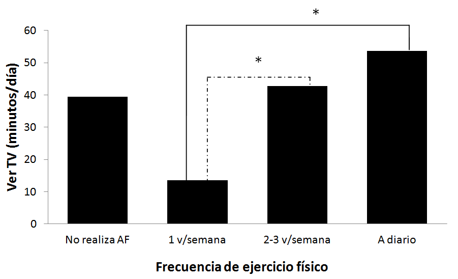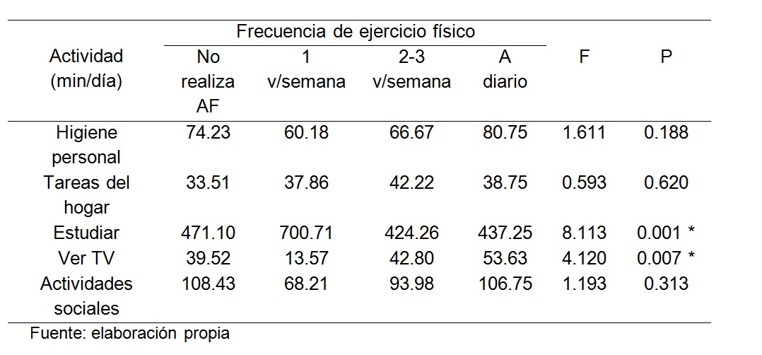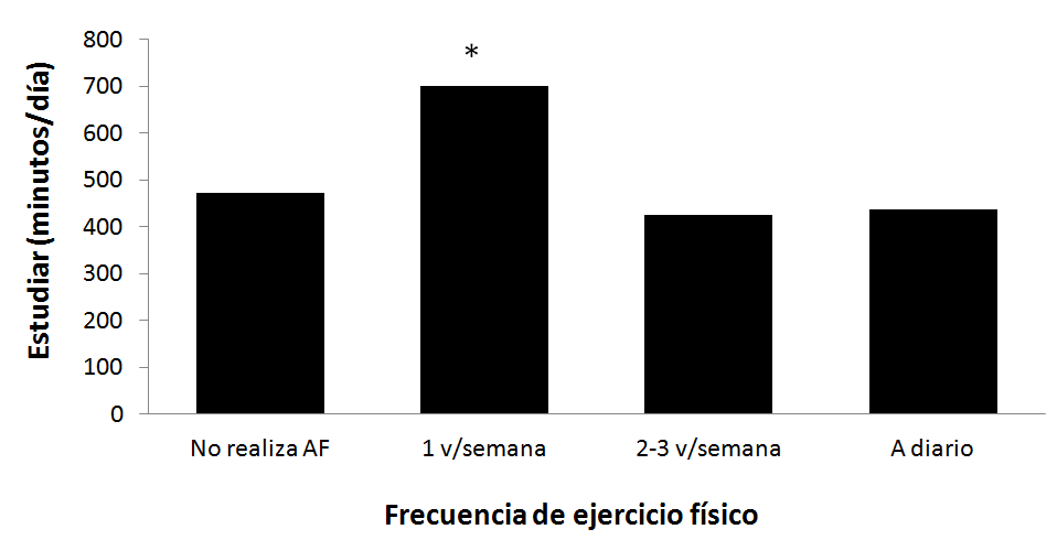 Finalmente, el análisis del tiempo destinado a actividades cotidianas, según la frecuencia semanal de actividad física, mostró que aquellas y aquellos estudiantes que realizaron ejercicio físico una vez a la semana fueron quienes, en forma estadísticamente significativa (p < 0.05), invirtieron más tiempo en estudiar (figura 1) y menos en ver la televisión (figura 2). Este comportamiento podría ser analizado en mayor profundidad en futuras investigaciones, para comprender mejor cómo organizan su tiempo estos estudiantes, en relación con la práctica del ejercicio.
