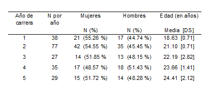 No se encontraron diferencias significativas entre hombres y mujeres para las distintas variables medidas, por lo cual los resultados obedecieron al análisis del conjunto de los 206 sujetos que participaron en el estudio. En total, completaron satisfactoriamente los instrumentos 109 mujeres (52.91 %) y 97 hombres (47.09 %), con una edad media de 21.69 ± 2.83 años. La tabla 1 detalla la distribución por sexo y edades para cada año de carrera.