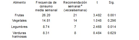 La tabla 2 muestra las medias de consumo semanal de los sujetos para los diferentes grupos, en comparación con las recomendaciones planteadas en las Guías Alimentarias para Costa Rica (Ministerio de Salud de Costa Rica, 2011) y Dapcich, Salvador, Pérez, Aranceta y Serra (2004). Los sujetos consumieron cantidades significativamente mayores de frutas (p = 0.001) y legumbres (p = 0.014), y cumplieron con los requerimientos mínimos de vegetales y verduras harinosas.