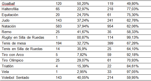 La Tabla 3 muestra una discrepancia muy grande entre hombres y mujeres. En el estudio de Corrêa et. al. (2014) la predominancia masculina fue notable, mientras que en las disciplinas paralímpicas los números son aún mayores. La única excepción es el Goalball, una disciplina en la cual las mujeres superan ligeramente a los hombres en el número de becas concedidas. Pero en las otras 21, el sexo masculino presenta el mayor porcentaje de becas. En algunos deportes como la Vela, el Rugby en Silla de Ruedas, el Tiro con Arco, el Ciclismo y el Canotaje, los hombres reciben más de 90% de los beneficios.