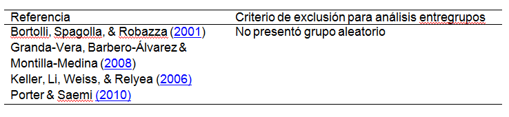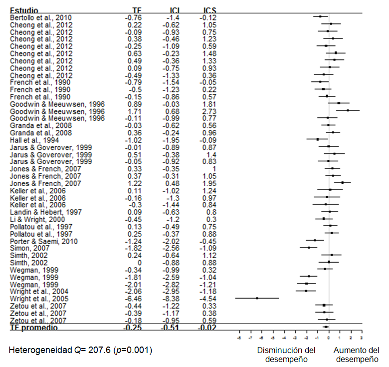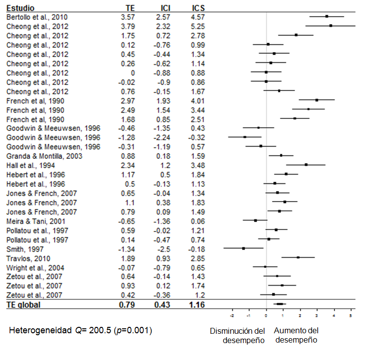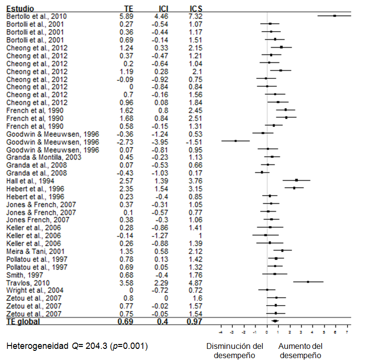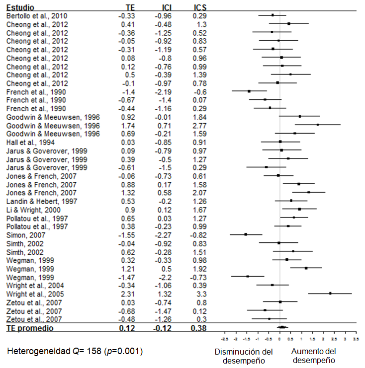 Algunas diferencias halladas entre los metaanálisis pueden responder a los estudios individuales incluidos en el cálculo de los TE, ya que Mazzardo y Brady incluyeron estudios en donde se pudiera calcular un TE a partir de un valor F; mientras que en el metaanálisis de Jiménez et al. (2014) y en el presente estudio, fue un criterio de exclusión. Otra diferencia importante en el cálculo de los TE individuales, es que Mazzardo mencionó que cuando no había significancia estadística asignaba un TE= 0. Lo que no se consideró en el presente estudio, ya que como se mencionó con anterioridad, esto no es recomendable en un estudio metaanalítico (Borenstein et al., 2009)