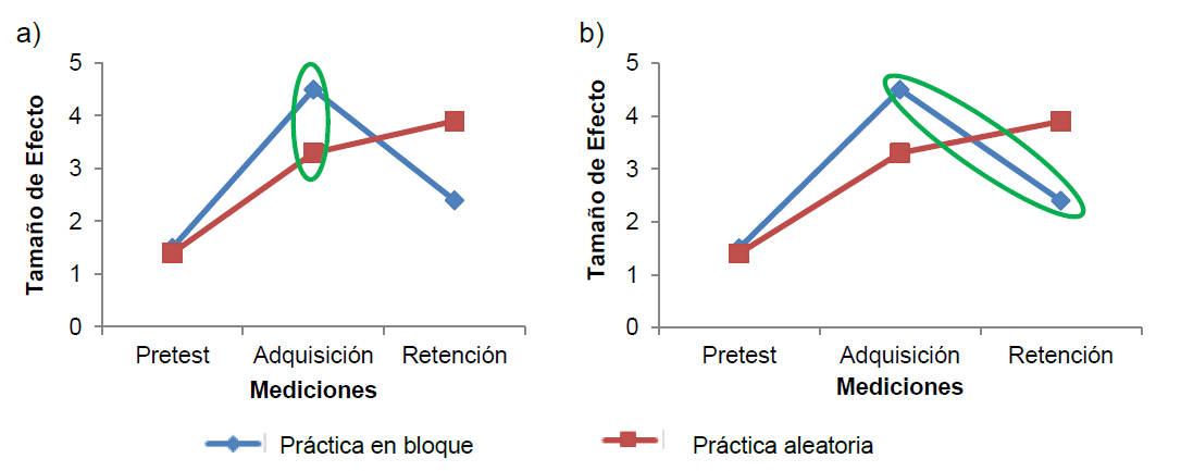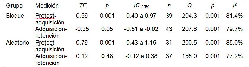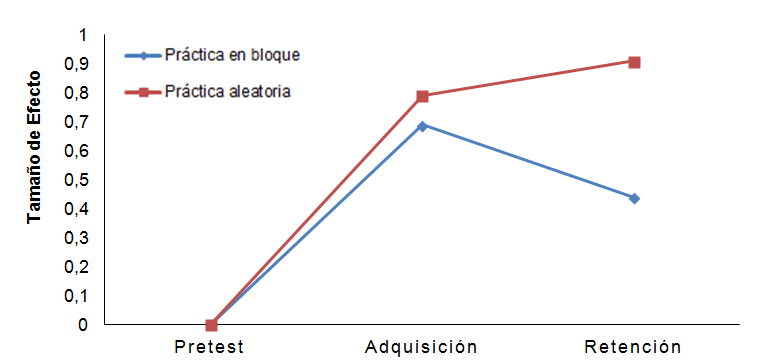 Jiménez et al. (2014) orientaron su análisis en el desempeño de cada grupo (práctica en bloque y aleatoria) a lo largo de las mediciones, donde se cuantificó el cambio entre el pretest-adquisición y entre la adquisición-retención (diseño intragrupo). Jiménez et al. (2014) reportan un TE global de 0.34 (n= 150) procedentes de 25 estudios, y concluyen que ambos tipos de práctica ayudan a mejorar el desempeño de la destreza en la adquisición, sin embargo, no se encontró diferencia entre la adquisición y la retención. En este estudio no se especifica el TE entre las mediciones en cada grupo de práctica.