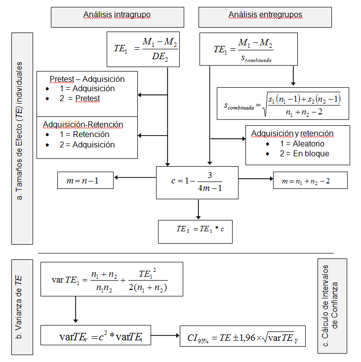 Después de aplicar la corrección, se revisó cada uno de los TE individuales con el fin de verificar que un TE positivo indica una mejoría en el desempeño, mientras que un TE negativo indica una disminución en el desempeño. El cálculo del TE para el diseño intragrupo fue el mismo que se utilizó en Jiménez et al. (2014).