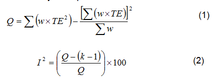 En el análisis de ambos diseños se incluyó la prueba de heterogeneidad de Q y la I2 estadística, con la utilización de las fórmulas 1 y 2, respectivamente.