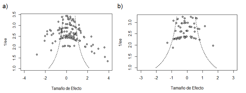 Además, se realizó un gráfico de embudo, para cada diseño, con el objetivo de analizar de forma cualitativa los diferentes sesgos, entre ellos de publicación, de idioma, entre otros. Además, se realizó la regresión de Egger.