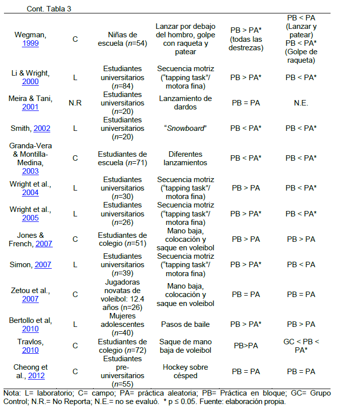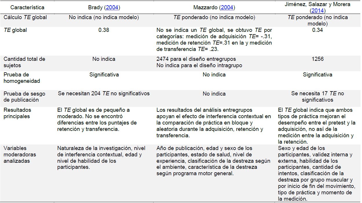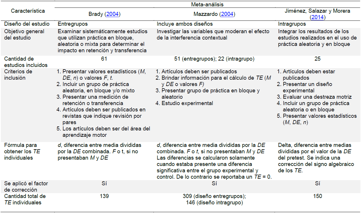 Adicional al estudio de Shea y Morgan (1979), se han realizado varias investigaciones que comprueban la hipótesis del EIC en la adquisición, retención y/o transferencia en destrezas motrices, con la utilización de la práctica en bloque, aleatoria y en serie (Bertollo, Berchicci, Carraro, Comani, & Robazza, 2010; Cheong, Lay, Grove, Medic, & Razman, 2012; French, Rink, & Werner, 1990; Goodwin & Meeuwsen, 1996; Hall, Domingues, & Cavazos, 1994). Dada la controversia de resultados, se han realizado tres metaanálisis (ver Tabla 1) con el objetivo de determinar el Efecto de la Interferencia Contextual en el aprendizaje de destrezas motrices y analizar posibles variables moderadoras (Brady, 2004; Jiménez, Salazar, & Morera, 2014; Mazzardo, 2004).