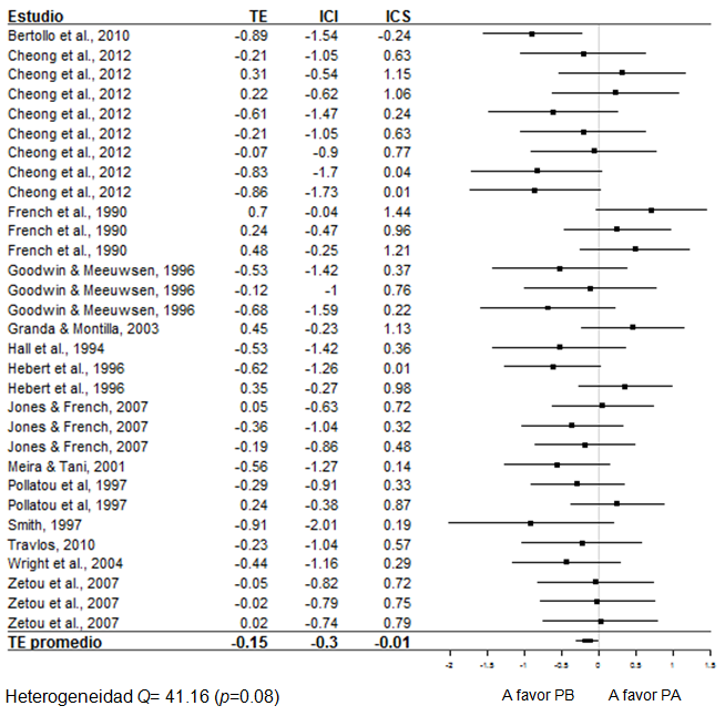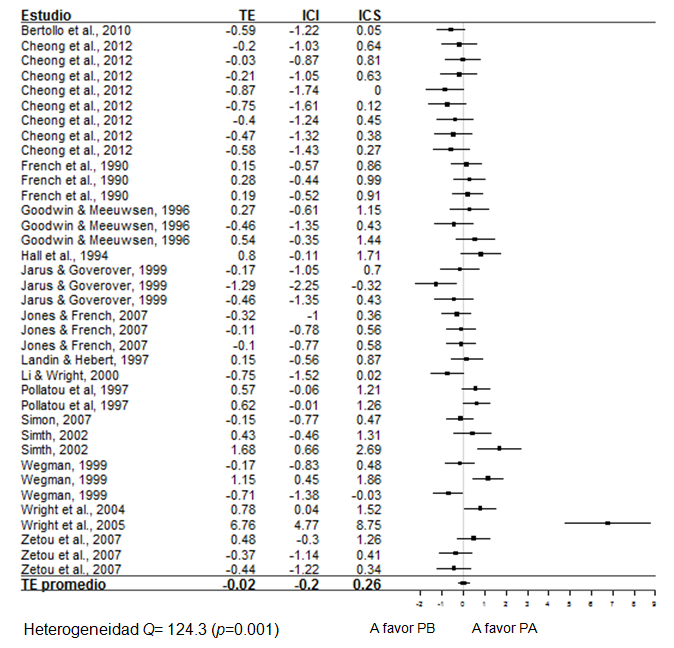 En este análisis se revisó el signo algebraico con el fin de que un TE positivo indique que el grupo de PA presenta desempeño mejor, en comparación al grupo de PB; mientras que un TE negativo indica que el grupo de PB presenta mejor desempeño en comparación con el grupo de PA. También se calculó el intervalo de confianza de cada TE individual.