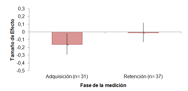 Fuente: elaboración propia.El TE global indica que el grupo de PB presentó un desempeño mejor con respecto al grupo de PA en la medición de adquisición. Mientras que, en la medición de retención, el TE indica que la diferencia en el desempeño entre los dos grupos no es significativa (ver Figura 13).
