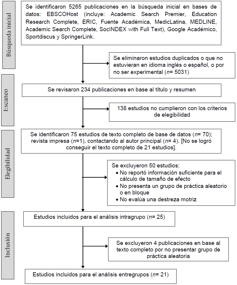 Al igual que en Jiménez et al. (2014) se consideraron estudios experimentales relacionados con la interferencia contextual, que incluyeran al menos un grupo de práctica, ya sea en bloque o aleatoria, el estudio debe haber sido realizado con humanos, no hubo restricción de edad, sexo o habilidad motriz, entre otras. Además, deben evaluar dos o más destrezas motrices, o dos o más variaciones de una destreza motriz. Por último, no hubo restricción de año de publicación. Se limitó la búsqueda a estudios en idioma inglés o español.