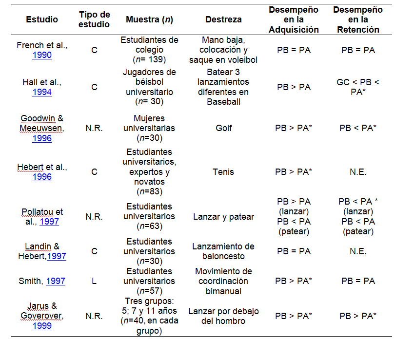 En el análisis entregrupos se encontró que en la adquisición el grupo de PB presentó un desempeño mejor que el grupo de PA; esto concuerda con lo encontrado por Mazzardo (2004). En el presente metaanálisis, no se halló diferencia entre los grupos en la retención, aunque en general y apoyado por Brady (2004) y Mazzardo (2004) el grupo de PA tiende a presentar un desempeño mejor en comparación al grupo de PB.