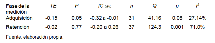 Se incluyeron 21 estudios (ver Tabla 3), los cuales generaron un total de 68 TE individuales y un total de 721 sujetos. En la Tabla 4 se muestran los TE globales calculados para cada medición, su significancia (p), su respectivo intervalo de confianza (IC95%) y los análisis de heterogeneidad (Q, I2); además se indica la cantidad de TE individuales incluidos en el análisis (n). En las Figuras 11 y 12 se muestra la dispersión de los TE individuales, para la medición de adquisición y retención respectivamente.