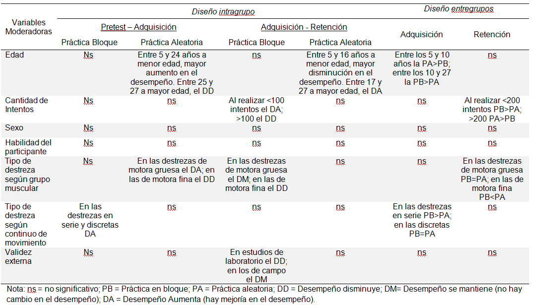 En el análisis de las variables que influyen en el cambio en el desempeño (diseño intragrupo) y en la diferencia en el desempeño entre los grupos de práctica (diseño entre grupos) se encontró que la edad, la cantidad de intentos, el tipo de destreza según el grupo muscular y la continuidad del movimiento, además de la validez externa (tipo de estudio) son factores influyentes.