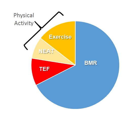 In addressing TDEE and sedentary lifestyle, the physical-activity component of TDEE has been further dissected into planned activity, i.e. exercise, and NEAT, which can be considered movement that doesn’t reach a threshold for fitness but from a cumulative standpoint, could demand appreciable calories during the day. Spontaneous activity would be considered a part of NEAT. Early work to separate exercise and NEAT suggested that fidgeting, a form of NEAT, could contribute expenditures of up to 800 kcal per day (3350 KJ) (Ravussin, Lillioja, Anderson, Christin, & Bogardus, 1986). Using a room calorimeter and motion detectors, Ravussin and colleagues were able to dissect the components of total daily energy expenditure in 177 subjects who remained in the chamber for 24 h (Ravussin et al., 1986). They attributed an average of 8.7%, with a range of 3.9 to 16.6%, of the TDEE to spontaneous movement based on oxygen consumption and motion assessment. A cumulative effect of NEAT over a period of years could help explain why some individuals remain relatively lean and at normal body mass without engaging in formal exercise or restricting caloric intake (Johannsen et al., 2008; Ravussin et al., 1986; Levine, 2002).