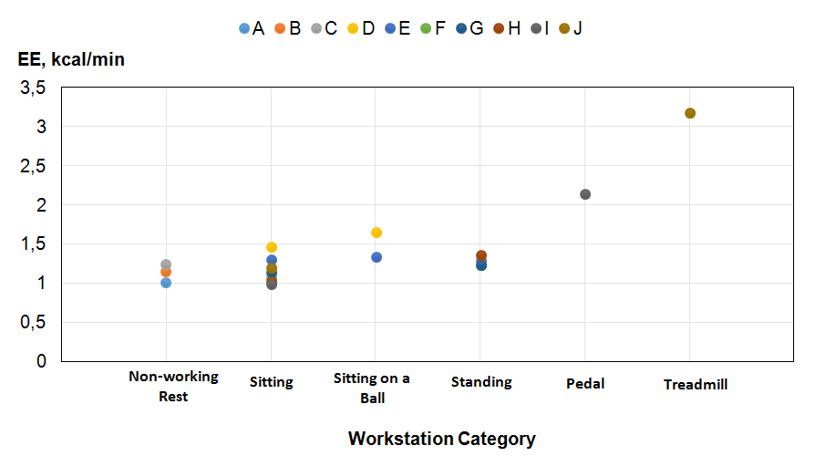 Energy Expenditure. The increase in daily energy expenditure through alternative workstations helps offset daily energy intake and cumulatively benefits the individuals in the long term. Evidence indicates that the rate of energy expenditure varies depending on the category of the workstation alternative. This can be seen in Figure 2, which summarizes the mean values in the literature for energy expenditure at various workstations. The pattern suggests that generally, while reactive workstations elevate metabolism, the expenditure remains lower than proactive workstations. In one case, the rate of energy expenditure while using a reactive workstation did not rise above that of merely sitting at a workstation (Speck and Schmitz 2011).