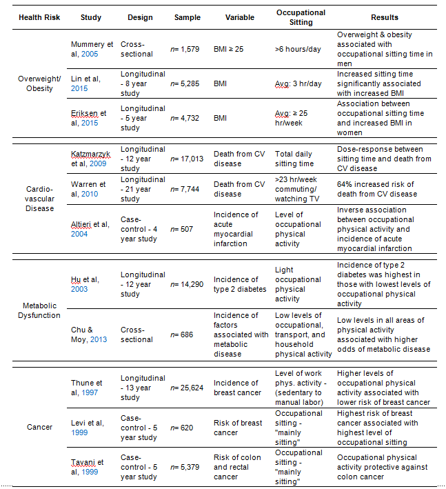 The health risks of occupational sitting include being overweight and obese. A summary of several large scale studies supporting this are seen in Table 1. The work of Lin, Courtney, Lombardi, & Verma, (2015) and Eriksen, Rosthøj, Burr, & Holtermann (2015) show the development of obesity linked to hours of sitting, indicating