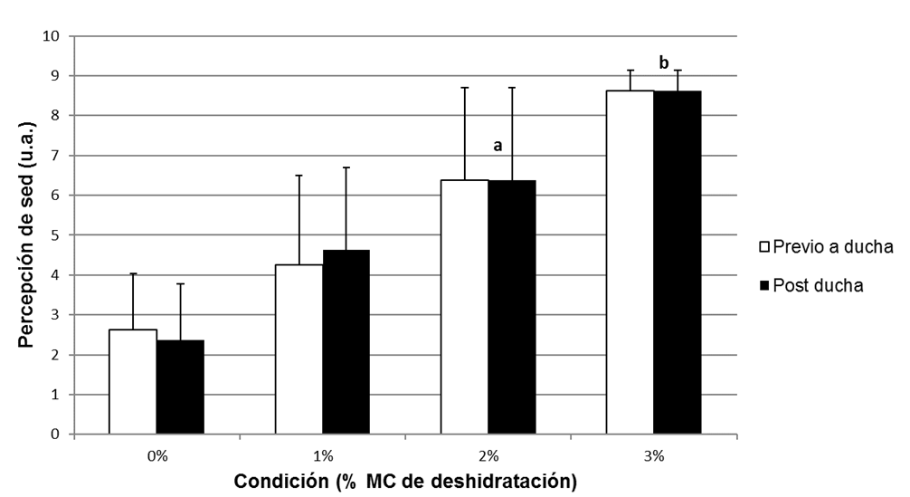 En este estudio examinamos la respuesta de la sed a la ingesta de un volumen de agua constante, predeterminado, luego de ejercitarse en el calor a distintos niveles de deshidratación. En primer lugar, confirmamos que la percepción subjetiva de la sed posterior al ejercicio fue capaz de detectar niveles de hipohidratación equivalentes a 2%MC o superiores: los puntajes para 3% y 2% de deshidratación fueron distintos de 0%, mientras que para 3% también fue distinto de 1%. Luego, evaluamos la confiabilidad de la escala de percepción de la sed de Engell inmediatamente después del ejercicio mediante una estrategia novedosa de test-retest: en vez de la separación convencional de 24 horas entre las pruebas—un protocolo que en el presente estudio habría introducido una variabilidad ajena no deseable—separamos las pruebas por solamente 30 minutos. El protocolo le exigió a cada participante tomar una ducha fría, aportar una muestra de orina, desvestirse para el pesaje desnudo y dejarse colocar un catéter en el antebrazo, todo entre las dos pruebas de PS postejercicio, para las condiciones de deshidratación de 0, 1, 2 y 3%MC del estudio. Este procedimiento introdujo suficiente “ruido” para distraer a los participantes sin alterar las variables fisiológicas de interés. En ausencia de ingesta de agua, los resultados de PS fueron confiables (CCI r = 0.973). Además, la diferencia entre ambos puntajes no fue significativa (p = 0.862).
