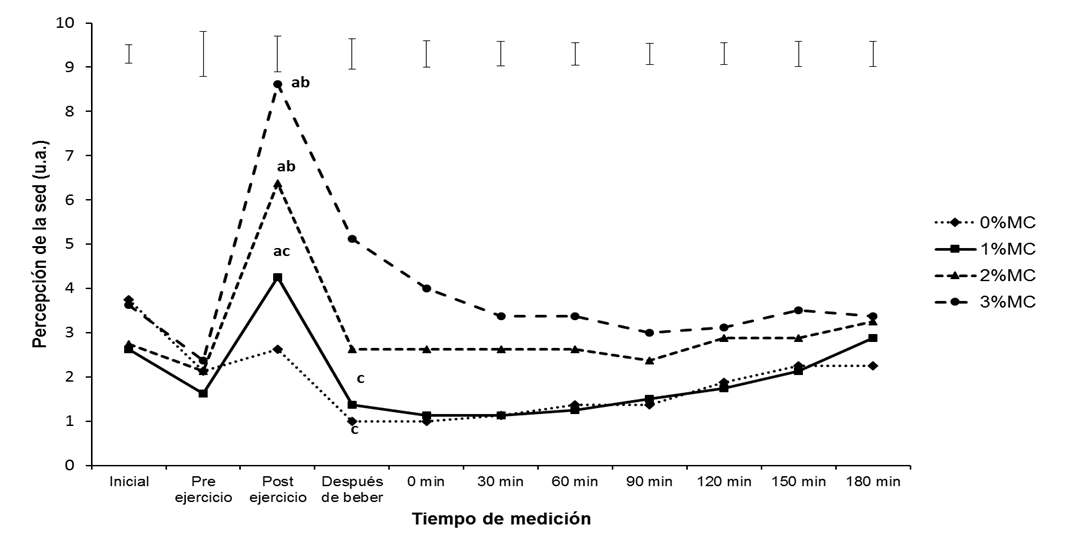 Al analizar el tiempo total de observación, la percepción de sed mostró una interacción significativa entre tiempo y condición (p < 0.0001, Figura 2). El efecto principal de tiempo fue significativo (p < 0.0001), así como el efecto principal de condición (p < 0.0001). Al finalizar el ejercicio, tanto la condición de 3% (8.63 [8.19, 9.06], media [IC95%]) como de 2% (6.38 [4.43, 8.35]) fueron diferentes de 0% (2.62 [1.45, 3.80]), pero la de 1% no lo fue (4.25 [2.37, 6.13]). El análisis post hoc para cada condición mostró un aumento significativo en la sed después del ejercicio en comparación con la registrada antes de éste (p < 0.05), y un regreso a los puntajes preejercicio inmediatamente después de la rehidratación, para todas las condiciones excepto la de 0% de deshidratación.