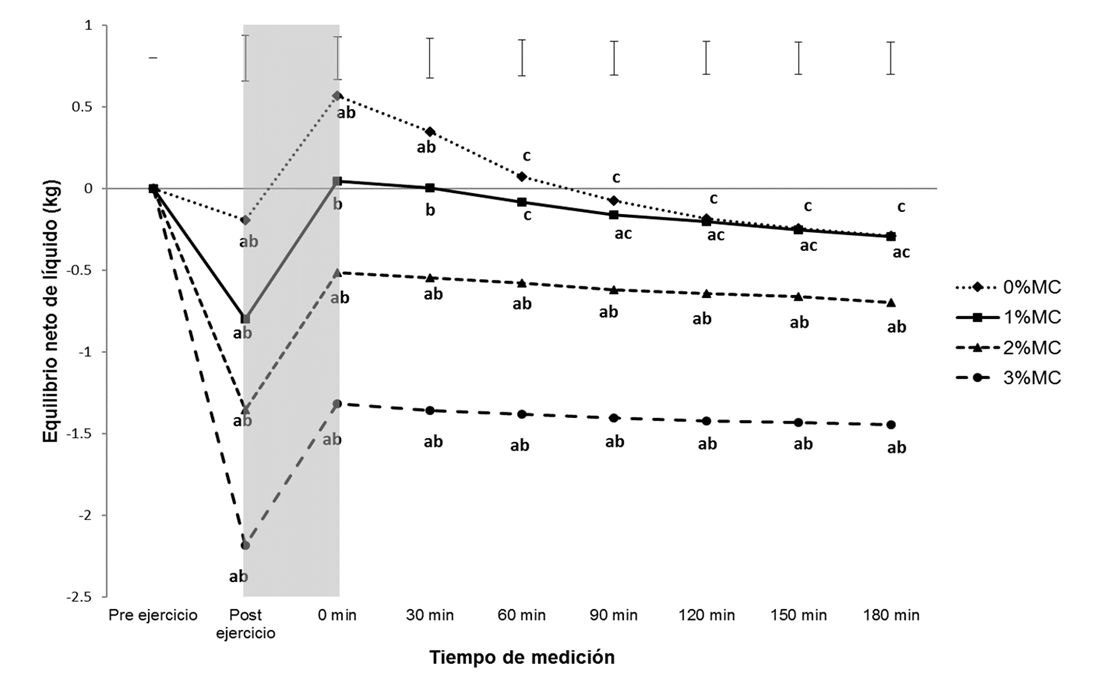 La Figura 3 muestra el equilibrio neto de líquido. Hubo una interacción significativa entre tiempo y condición (p < 0.0001), así como efectos principales significativos tanto para el tiempo (p < 0.0001) como para la condición (p < 0.0001). El equilibrio neto de líquido fue negativo para todas las condiciones luego del tiempo de ejercicio, pero se mantuvo por debajo de cero luego de ingerir líquido solamente en las condiciones de deshidratación de 1%, 2% y 3%, con la excepción de la primera hora en la condición de 1% de deshidratación. La condición 0%MC mantuvo un equilibrio de líquido positivo o neutral hasta el final de la observación. En ese momento, el ENL promedio fue de -290 g, con un IC95% entre -627 y 47g. El equilibrio neto de líquido fue diferente entre las condiciones en todos los momentos de medición, excepto que la diferencia entre 0% y 1% desapareció a partir de la medición a los 60 minutos.