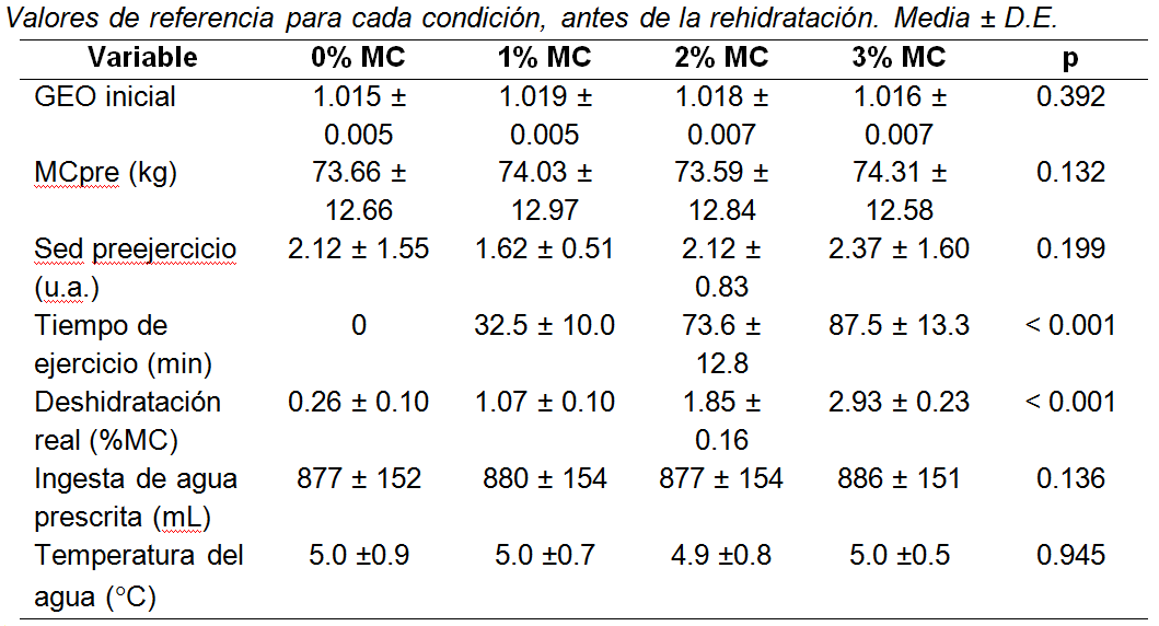 Para verificar que todos los participantes mostraran las mismas características bajo cada una de las condiciones, pero que alcanzaran las diferencias esperadas, se realizaron varios análisis de varianza de una vía de medidas repetidas, utilizando cada una de las siguientes variables dependientes: GEO de referencia, masa corporal preejercicio, sed preejercicio, tiempo de ejercicio, deshidratación real alcanzada e ingesta de agua prescrita.