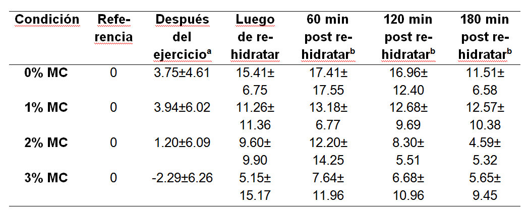 La Tabla 2 muestra los cambios del volumen plasmático para las diferentes condiciones. No hubo interacción significativa entre condición y tiempo de medición (p = 0.883). No hubo efecto principal de la condición (p = 0.064), pero el efecto principal del tiempo de medición sí fue significativo (p < 0.0001). El volumen plasmático fue más alto en todos los instantes después de la rehidratación, en comparación con la referencia (p < 0.05). También fue más alto a los 60, 120 y 180 minutos, en comparación con el postejercicio