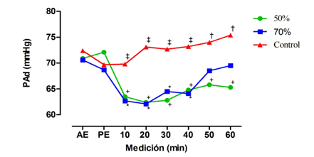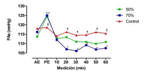 Cuando se confronta la PAd de las condiciones de ejercicio con la condición control, se obtiene que la PAd posterior al ejercicio de 50% es significativamente menor que la condición control del minuto 10 al minuto 60 (símbolo †), mientras que la PAd posterior al ejercicio de 70% es significativamente menor que la condición control desde el minuto 10 hasta el minuto 40 (símbolo ‡).